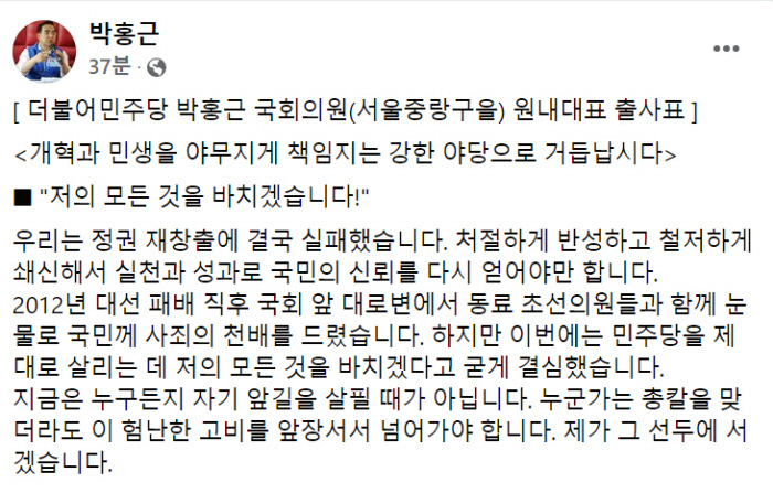 박 의원은 “민주당을 살리는 데 저의 모든 것을 바치겠다고 굳게 결심했다”며 “누군가는 총칼을 맞더라도 험난한 고비를 앞장서 넘어가야 한다. 제가 그 선두에 서겠다”고 밝혔다.