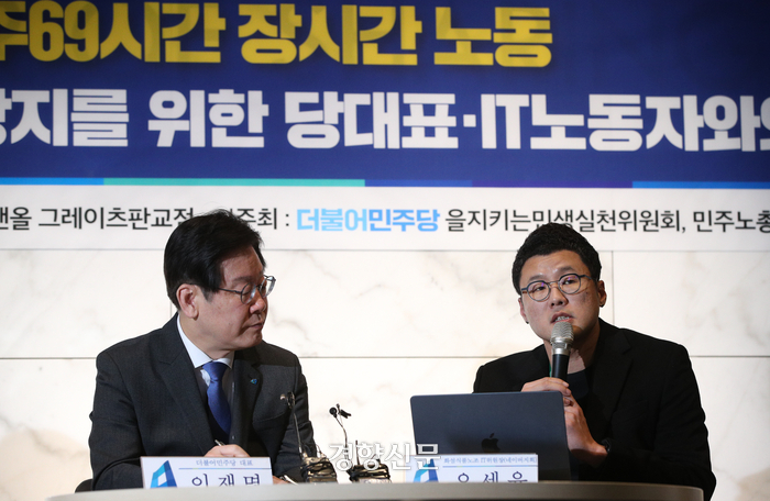 이재명 민주당 대표는 22일 국회에서 열린 당 최고위원회의에서 “국민을 과로사로 내모는 노동개악을 반드시 저지하겠다”며 “주 4.5일제로 나아가야 한다”고 말했다. 이 대표는 지난 14일 경기 성남시 판교에서 정보기술(IT) 노동자들과 간담회에서 “대선에서 말씀드렸던 주 4.5일제 도입을 추진해나가는 계획”이라고 말했다. 김성환 민주당 정책위의장은 전날 기자간담회에서 “주 4.5일제를 추진하는 기업에 인센티브를 줘서 4.5일제로 점진적으로 전환될 수 있도록 하는 법안도 다음주에 발의할 예정”이라고 말했다.