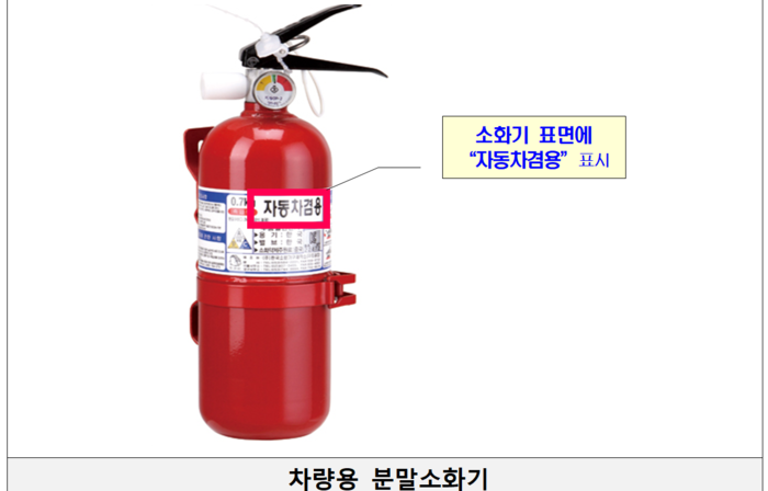 오는 12월부터 5인승 이상 승용차의 차량용 소화기 비치가 의무화된다. 해당 시점 이후 제작·수입·판매되거나 소유권이 바뀌는 차량이 대상이다.