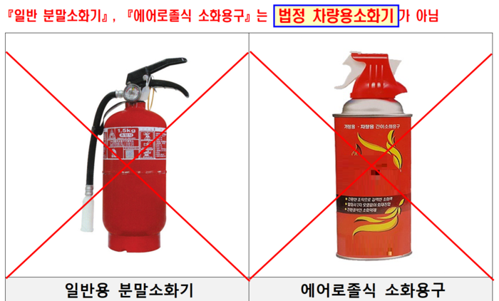 자동차에 비치되는 소화기는 겉면에 ‘자동차 겸용’ 표시가 있어야 한다. 표시가 없는 일반 분말소화기나 에어로졸식 소화용구는 해당하지 않는다. 또 소화기의 내용물이 새거나, 외형에 금이 가거나, 파손·변형된 것을 비치하면 안 된다. 소화기의 비치·설치는 정기적으로 실시하는 자동차 검사 때 확인하게 된다.