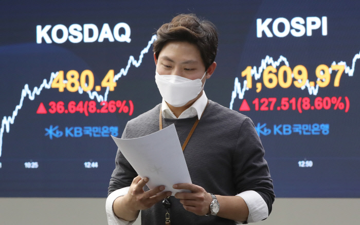 한편 코스피지수가 전날보다 8.6% 오른 이날 유가증권시장 시가총액은 1000조원대를 회복했다. 시가총액이 전날보다 85조2450억원이 오르면서 1083조695억원에 이르렀다. 코스닥 시가총액도 전날보다 13조3580억원이 올라 175조9210원이 됐다. 이날 하루동안 코스피·코스닥시장에서 늘어난 시가총액은 총 98조603억원이다.
