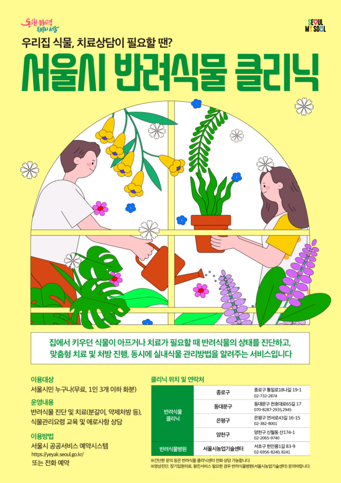 서울시는 종로·동대문·은평·양천구 등 4곳에 운영 중인 반려식물 클리닉을 올해 9곳으로 늘리기로 했다고 25일 밝혔다.
