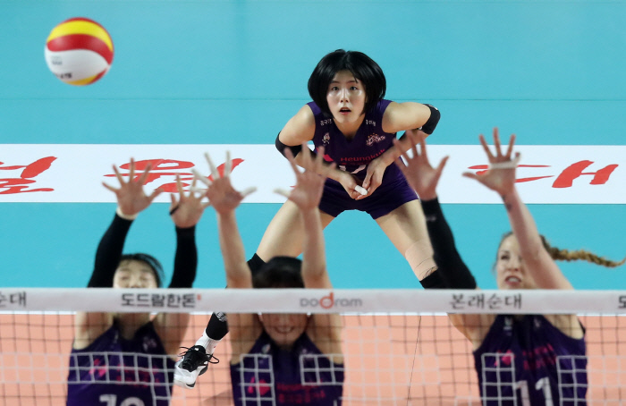흥국생명 이재영이 25일 경북 김천실내체육관에서 열린 여자프로배구 챔피언결정전 3차전 한국도로공사와의 경기에서 수비하고 있다. 김천 | 연합뉴스