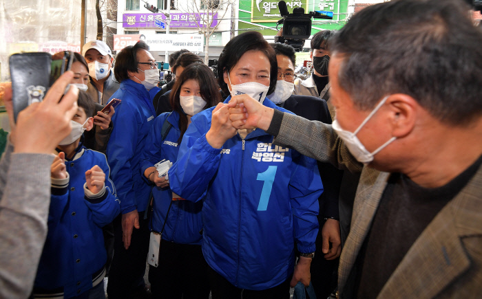 박영선 더불어민주당 서울시장 후보가 코로나19 여파로 유세를 중단했다. 전날 유세에 동행했던 정청래 민주당 의원이 코로나19 확진자와 밀접 접촉했기 때문이다.