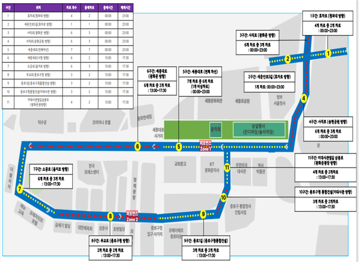 서울시는 “세종대로를 지나는 버스 노선이 우회 운행하고, 구간 내 시내버스 정류장은 폐쇄된다”며 “종로로 이동하려는 시민은 인근 정류장에서 하차한 후 걷거나 지하철로 이동해야 한다”고 밝혔다. 서울시는 “시내버스를 이용할 때 버스정류장 및 차내에 부착된 우회 운행 안내문을 참고해 우회 경로를 사전에 확인하는 것을 추천한다”고 덧붙였다.