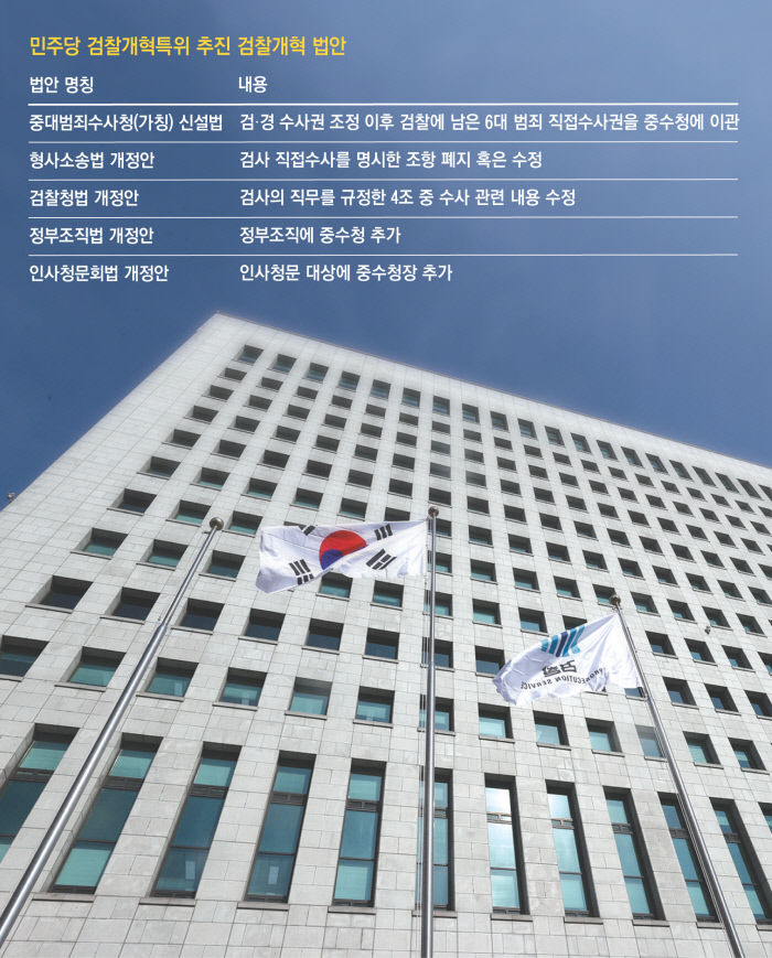 검찰개혁특위가 발의를 준비하고 있는 법안은 총 5개다. 그중 핵심이 되는 것은 중수청설치법이다. 중수청이라는 별도의 조직을 두고, 올해 초 검경 수사권 조정에 따라 검찰이 보유한 6대 범죄(부패·경제·공직자·선거·방위산업·대형참사)의 수사권을 중수청으로 이관토록 하는 내용이 담기게 된다.