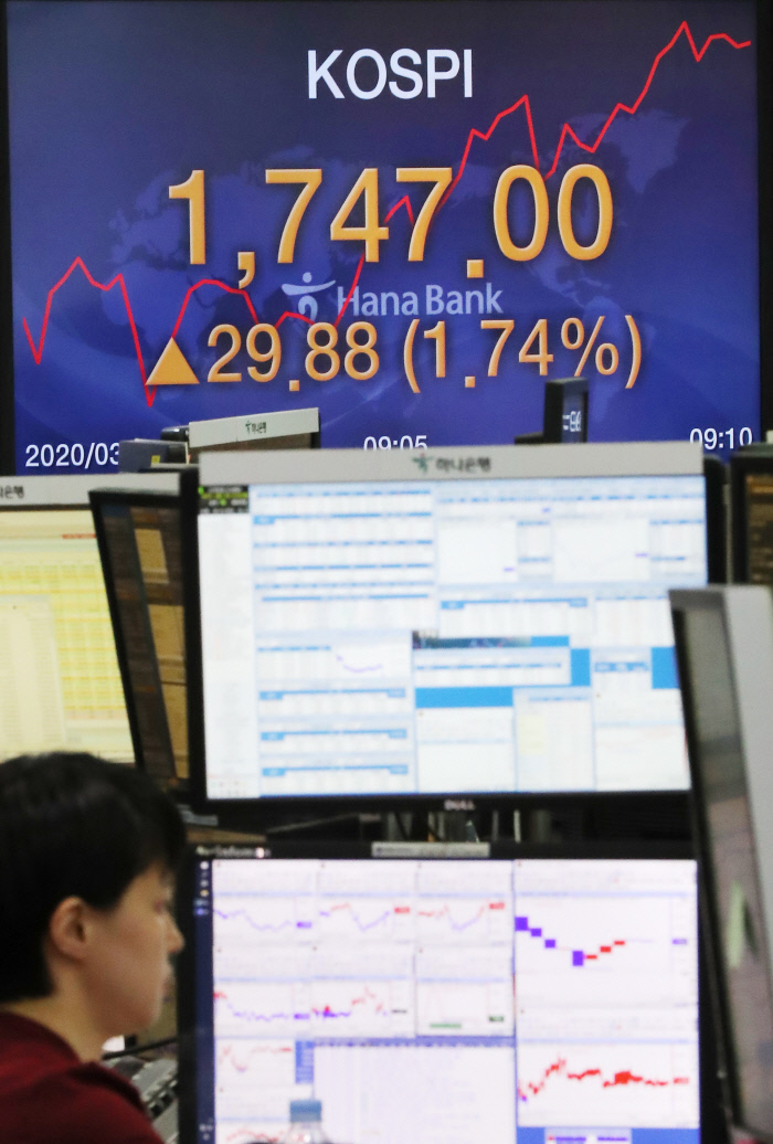이날 오전 9시50분 코스피는 전 거래일보다 26.55포인트(1.52%) 오른 1743.21을 기록했다. 개장과 동시에 오름세를 유지하다 장 한 때 1757.81까지 기록하기도 했다. 코스닥도 전날보다 16.68포인트(3.08%) 오른 558.79를 기록했다.