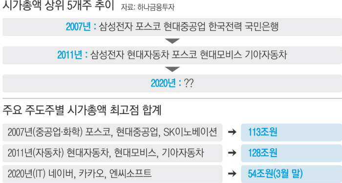 시가총액 비중이 큰 대형 정보기술(IT) 회사들의 성장도 주목받고 있다. 하나금융투자는 “2008년 금융위기 이후 자동차주 전성시대가 찾아왔는데 (이번 코로나19 위기 이후에는) 비대면 산업이 그 지위를 차지할 수 있다”고 분석했다.