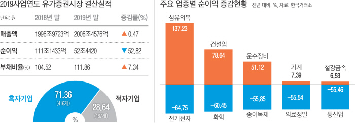 반도체 외에도 전반적으로 국내 업황은 좋지 않았다. 거래소가 분류한 17개 업종 중 절반이 넘는 9개 업종의 당기순이익이 감소했다. 2018년 흑자를 기록했다 지난해 적자로 전환된 상장사는 72곳으로, 적자에서 1년 새 흑자로 전환된 기업 수(49곳)보다 많았다. 지난해 상장사들의 연결부채비율은 111.86%로, 전년보다 7.34%포인트 늘었다.