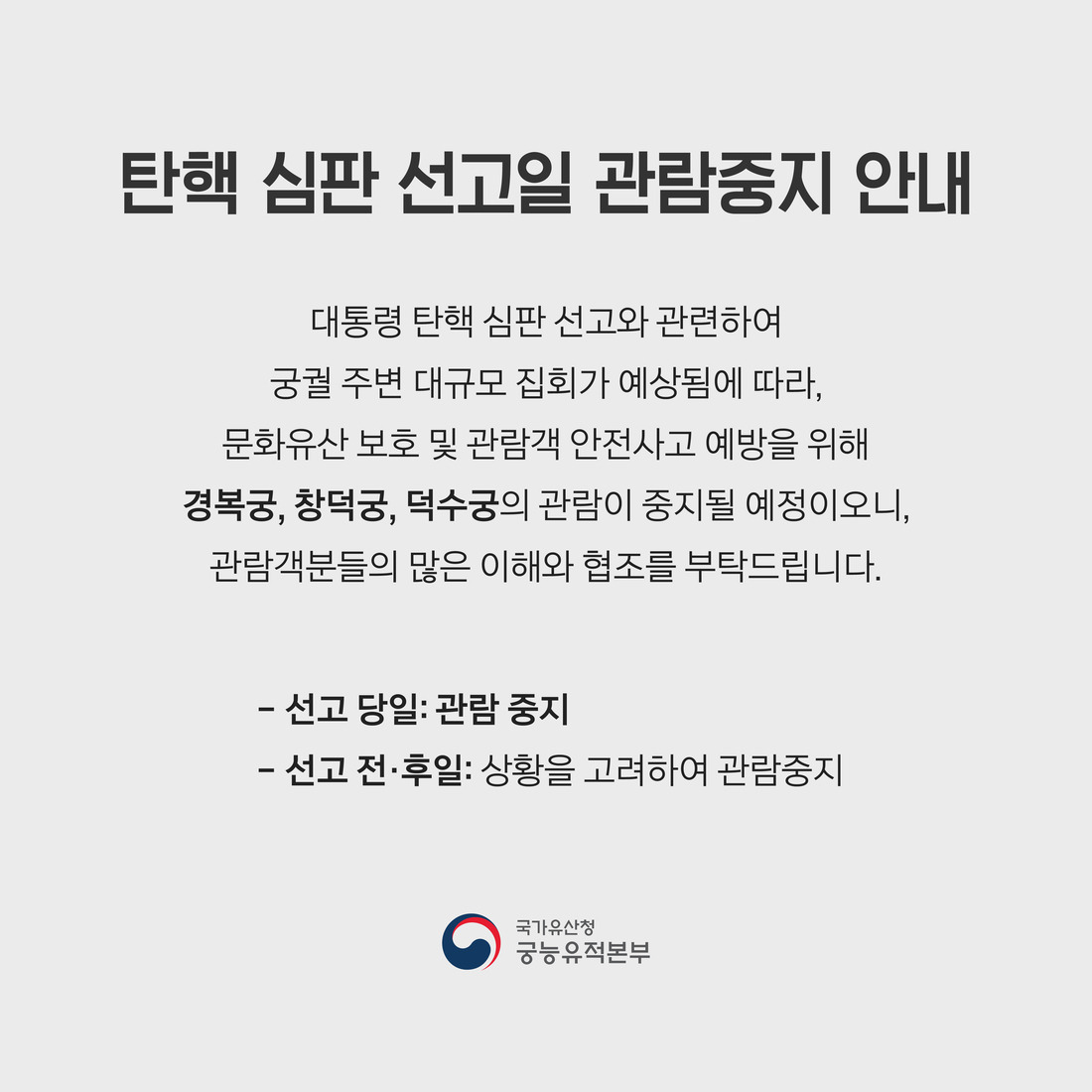 국가유산청 궁능유적본부는 1일 홈페이지에 “대통령 탄핵심판 선고와 관련해 궁궐 주변 대규모 집회가 예상된다”며 “문화유산 보호 및 관람객 안전사고 예방을 위해 경복궁, 창덕궁, 덕수궁의 관람이 중지될 예정”이라고 밝혔다. 궁능유적본부는 선고 전·후일에는 ‘상황을 고려해 관람중지’한다고도 덧붙였다.