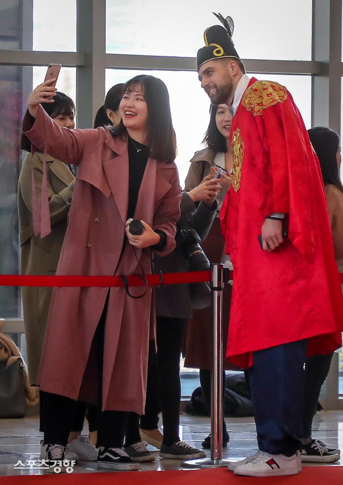 현대캐피탈 외국인 크리스티안 파다르가 1일 서울 양재동 더케이호텔에서 열린 도드람 2018~2019 V리그 시상식에서 한복을 입고 팬과 기념촬영을 하고 있다. 이석우 기자