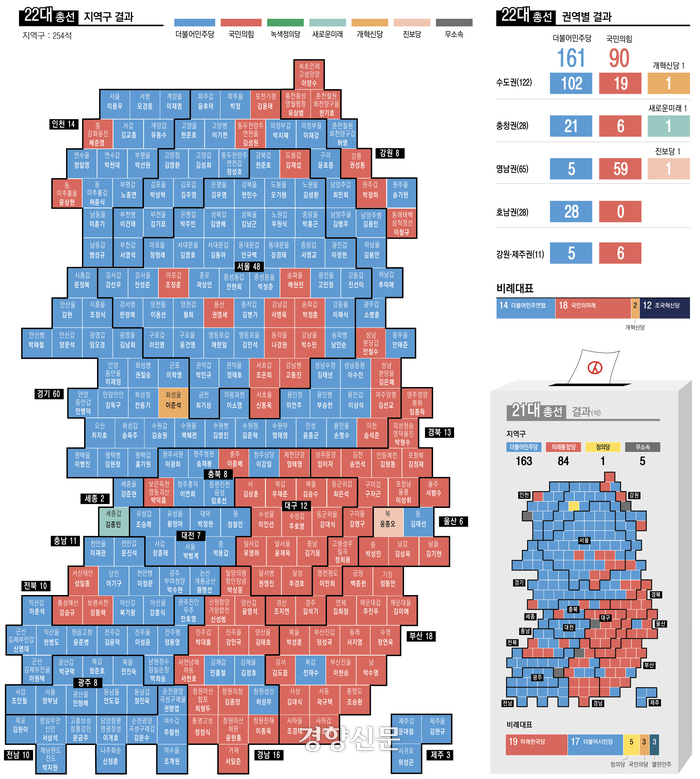 국민의힘은 서울에서 한강벨트에 속하는 동작을, 마포갑을 추가하고 도봉갑을 16년 만에 되찾아오는 것으로 만족해야 했다. 경기는 ‘경기도의 강남’으로 불리는 성남분당갑·을과 북한·강원과 인접한 포천·가평 등을 제외하면 전멸하다시피했다. 부동산·교통 공약을 내놓으며 공들였던 수원(5석), 고양·용인·화성(각 4석)에선 전패했다.