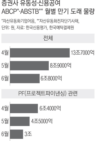 만기가 3개월로 짧은 PF-ABCP에는 보통 ‘시장에서 팔리지 않으면 증권사들이 사들인다’는 매입약정이 걸려 있다. 시장에서 수요가 많을 때는 수시로 발행하며 차환하는 데 문제가 없으나 최근 수요가 줄면서 증권사들이 이를 사들여야 할 상황에 놓였다. 한국신용평가는 최근 보고서에서 “이달에 만기가 도래하는 증권사의 PF-ABCP와 ABSTB가 6조4000억원에 이른다”며 “중소형 증권사들은 흡수여력이 크지 않아 주의가 필요하다”고 분석했다.