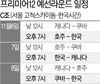 세계야구소프트볼연맹(WBSC)과 한국야구위원회(KBO)는 15일 서울 중구 웨스틴조선호텔에서 기자회견을 열고 오는 11월6~8일 고척스카이돔에서 열리는 2019 프리미어12 예선 C조 일정을 발표했다. 사흘 동안 매일 낮 12시와 오후 7시, 두차례씩 경기가 열리는데, 예선라운드 개최국인 한국은 모두 오후 7시에 경기를 치르게 됐다. 예선라운드의 향방이 결정될 수 있는 6일일 첫 경기는 호주와 치르게 됐고, 7일에는 캐나다와, 마지막날인 8일에는 쿠바와 각각 맞선다.