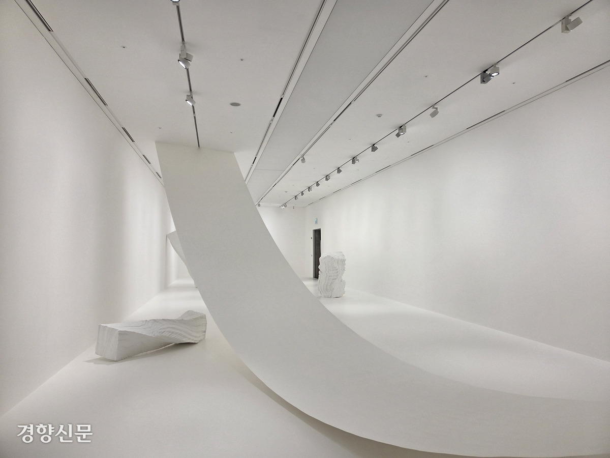 이배는 “대개 조각은 덩어리감을 보는 게 특징인데, 이번에는 그림과 같은 조각, 표면을 보는 조각을 세우고 싶었다”고 말했다. 대형 조각인 ‘불로부터’와 ‘붓질’ 모두 표면에 깊이 파인 선이 도드라진다. 숯으로 만든 ‘불로부터’는 보는 이가 표면을 만질 수 있도록 작품 주변에 차단선도 놓지 않았다. 그는 흰색으로 가득 채운 공간 ‘White’를 만든 이유를 설명하며 “안도 선생이 만든 공간을 살리고 싶다고 생각해 그림을 걸지 말아야겠다고 생각했다”고 말했다. 이배는 뮤지엄산을 설계한 일본 건축가 안도 다다오를 “굉장히 존경하는 건축가”라고 했다.