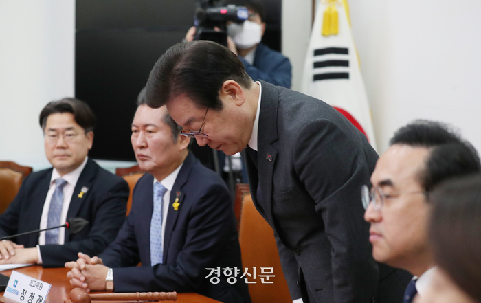 이재명 대표가 여러 혐의로 재판 또는 수사를 받는 상황이 민주당이 공천 배제 등의 쇄신안을 내기 어렵게 했다는 비판도 나온다. 민주당은 2014~2015년 비리 혐의 등으로 기소된 의원들의 공천을 배제하는 등 강도 높은 쇄신안을 연이어 발표하며 ‘혁신 드라이브’를 걸었다. 당 관계자는 “이 대표의 검찰 수사를 ‘정치 탄압’으로 규정한 뒤 다른 정치인들을 공천에서 배제하면 자가당착에 빠지는 것”이라고 말했다. 한 초선 의원은 “검찰 수사를 ‘정치 탄압’으로 강하게 규정하고 노웅래 의원 사건에서도 비슷한 입장을 취하면서 이 대표도 스텝이 꼬였다”고 말했다.