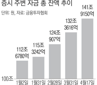 20일 금융투자협회에 따르면 지난 17일 현재 증시 주변 자금은 141조9150억원에 이른다. 증시 주변 자금은 투자자예탁금, 파생상품거래예수금, 대고객 환매조건부채권(RP) 잔고, 위탁매매 미수금, 신용융자 잔고 등을 합한 것이다. 증시 주변 자금은 주식시장의 예비 투자 자금 성격을 띤다. 증시 주변 자금은 전 거래일인 14일 141조7928억원으로 사상 최고 기록을 경신한 뒤 사흘 만에 다시 최고치를 찍었다.
