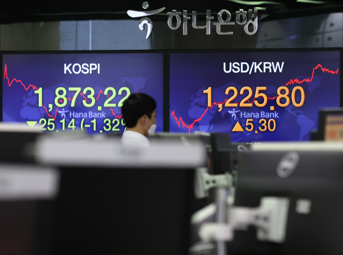 국내 유가증권시장 코스피는 이날 오전 11시40분 현재 1848.50을 기록했다. 전날 종가(1898.36)보다 49.86포인트(2.63%) 하락한 수치다.