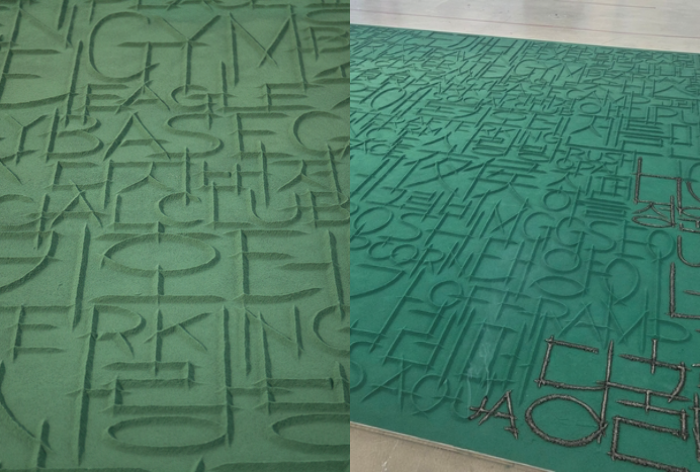 오인환의 설치작업 ‘남자가 남자를 만나는 곳, 서울’(2026)은 가로·세로 각 4m인 바닥에 서울의 게이바나 클럽의 이름을 향가루로 써 놓고 태운다. 성소수자에게는 친숙하지만, 다른 이들에겐 낯선 이름들은 전시 공간에 향을 내뿜으며 타오른다. 바닥과 같은 녹색으로 쓰여 잘 보이지 않던 이름들이 불탄 뒤 재와 함께 모습을 드러내면서 보는 이의 뇌리에 향과 함께 박힌다.