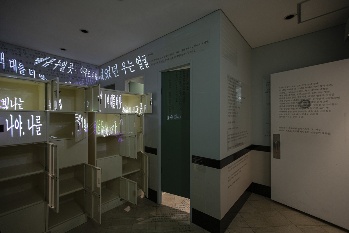 구자혜의 ‘퇴장하는 등장’(2026)은 여자 화장실에 캐비닛을 갖다 놓고 거울과 벽면, 바닥에까지 여러 문구를 새겨 넣은 설치 작품이다. 어떤 문구는 조명으로 캐비닛을 비춘다. 연극의 대사 같으면서도 불분명해 보이는 글귀들은 언어가 어떤 집단에는 배타적으로 작용할 수 있다는 점을있다는 점을 생각하게 한다.