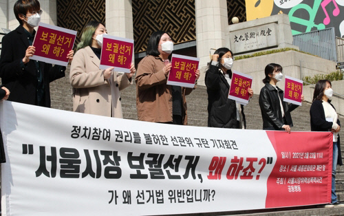 지난달 23일 ‘서울시장 위력 성폭력사건 공동행동’(공동행동)은 ‘보궐선거 왜 하죠?’라는 문구의 현수막을 게재하는 일이 선거법 위반에 해당한다는 답변을 선관위가 보냈다며 규탄 퍼포먼스를 벌였다. 공동행동은 ‘나는 성평등에 투표한다’ ‘나는 페미니즘에 투표한다’는 문구는 가능한지 선관위에 문의했지만 ‘위법 소지가 있다’는 답변을 들었다고 전했다.