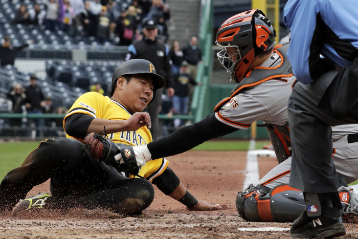 피츠버그 강정호가 이날 미국 펜실베이니아주 피츠버그 PNC파크에서 열린 2019 메이저리그 샌프란시스코전 9회말 홈으로 파고들다 상대 포수 버스터 포지에게 태그아웃되고 있다. 피츠버그 | AP연합뉴스