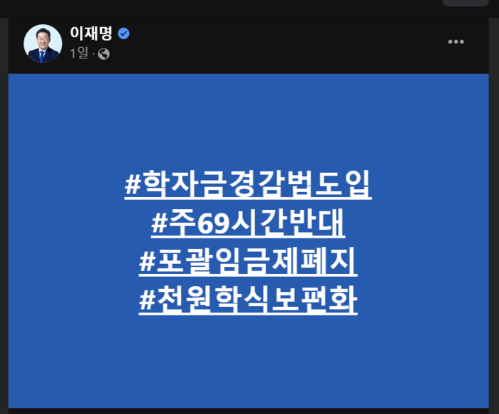 이재명 더불어민주당 대표가 지난 22일 학자금 경감법, 주 69시간 노동 반대, 천원 학식 등을 동시다발적으로 강조하며 지지자들의 호응을 유도했다. 관련 정책에 비판적인 여권 정치인을 향해서도 날선 반응을 보였다.