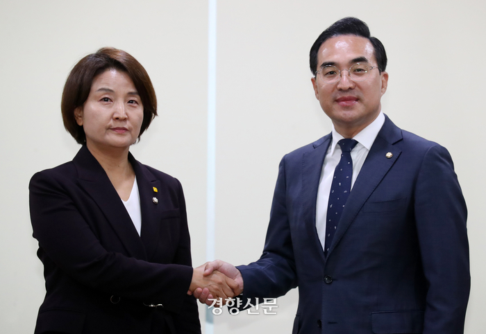 박홍근 민주당·이은주 정의당 원내대표는 25일 국회에서 회동한 뒤 이같이 결정했다고 밝혔다. 박 원내대표는 “합의에 따라 양 특검법 신속처리안건지정 동의안은 양당 의원을 포함해 발의에 동의하는 의원들의 날인을 거쳐 내일(26일) 오후 원내수석부대표들이 직접 국회에 제출하게 될 것”이라고 말했다.