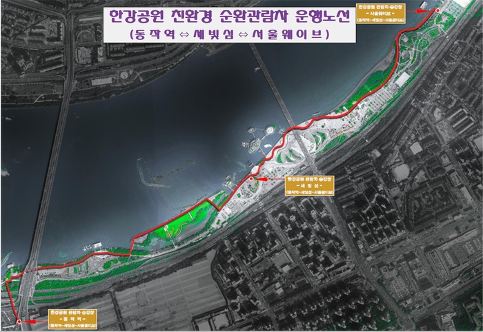 서울시는 한강공원을 이용하는 어린이, 고령층 등 이동 약자가 편하게 움직일 수 있도록 한강공원에 순환관람차를 도입했다. 지난해 12월 한강공원 순환관람차 운영 조례를 제정했고, 지난 2월부터는 서래섬 비포장도로 구간을 정비하는 등 운행 노선을 점검했다.