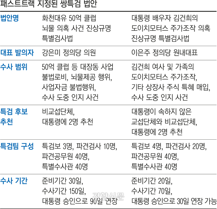 야권이 이날 패스트트랙 지정안을 의결한 특검법은 강은미 정의당 의원이 발의한 ‘화천대유 50억 클럽 뇌물 의혹 사건의 진상규명을 위한 특별검사의 임명 등에 관한 법률안’과 이은주 정의당 원내대표가 대표발의한 ‘대통령 배우자 김건희의 도이치모터스 주가조작 의혹 진상규명을 위한 특별검사 임명 등에 관한 법률안’이다.
