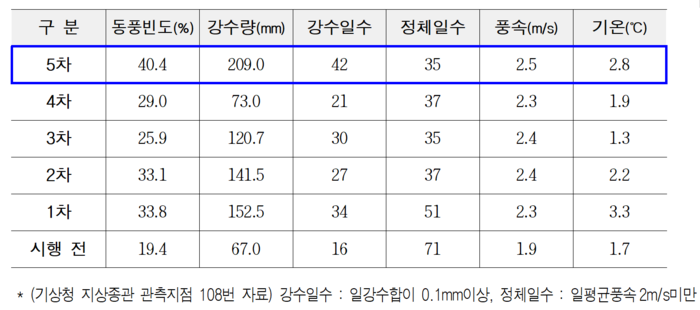 특히 이번 겨울 미세먼지 감소의 중요한 요인은 예년보다 많았던 강수량이다. 5차 계절관리제 기간 서울 강수일수는 42일, 강수량은 209.0㎜로 그간 관리제 기간 가운데 최대치였다. 기상청은 지난해 12월~올해 2월 수도권 강수량이 182.0㎜로 평년(66.2㎜)의 2.8배, 역대 최고 수준이라고 밝힌 바 있다.