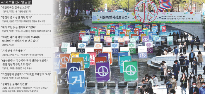 4·7 서울·부산 시장 보궐선거는 서울과 부산 두 대도시의 시장을 뽑는다는 점, 대선을 1년 앞두고 치러지기 때문에 대선 전초전 성격이 강하다는 점 등에서 선거전 시작부터 주목받았다. 접전이 예상됐던 서울시장 선거는 한국토지주택공사(LH) 사태를 기점으로 야당 우위로 반전되는 흐름이었다. 어느 때보다도 네거티브가 많았고 여야는 과도한 표현들을 주고받았다. 특히 ‘생태탕’ 논란은 정책이 사라지고 ‘진흙탕’이 된 이번 선거의 상징이라는 평가가 나온다. 선거 과정에서 이슈가 된 장면과 발언들을 정리했다.