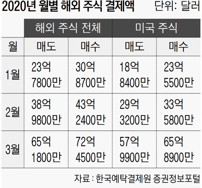 특히 그간 쉽게 참여할 수 없었던 미국 증시 참여가 두드러졌다. 지난달 미국 주식 결제액은 매수·매도액을 합쳐 123억8839만달러에 이르렀다. 다우존스30 산업평균지수, 스탠더드앤드푸어스(S&P) 500지수 등 뉴욕 증시 주요 지수들이 지난달 전월 대비 10% 이상 하락하는 동안 국내 투자자들은 그간 사지 못했던 인기 종목들을 비교적 싼 가격에 사들일 수 있었다. 미국을 비롯한 세계 각국의 잇단 경기 부양책을 발판으로 증시가 반등할 것이란 기대감도 해외 주식 거래 규모를 키웠다.
