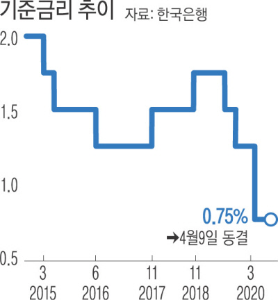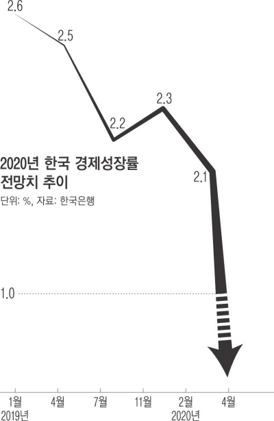 한국은행이 코로나19 확산 여파로 올해 한국 경제가 1%대 성장이 쉽지 않다고 전망했다. 지난 2월 2.3%에서 2.1%로 하향 전망한 데 이어 0%대 성장 가능성을 시사한 것이다. 기준금리는 사상 최저인 현재의 연 0.75%로 동결했지만 추가 인하 가능성을 열어놨다.