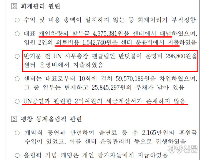 검사·감독에서는 특히 법인 돈을 대표 등 임원들의 ‘쌈짓돈’처럼 운영한 정황이 다수 발견됐다. 센터가 2016년 12월부터 2018년 1월까지 김 비서관의 대학병원 의료비와 합창단장 장모씨의 한의원·피부과 비용으로 총 154만2740원을 사용한 사실이 적발됐다. 센터는 감독기관인 방통위에 “단장 의료비는 2016년 유엔 출장 후 극도의 업무 스트레스로 인한 심한 두피 원형탈모의 치료비였으며, 경황이 없던 와중에 법인카드로 지출한 것”이라며 “대표 의료비는 평창올림픽 공연 취소·재개 통보, 출연진 선발, 학부모들과의 심한 갈등 등으로 인해 근무 중 급작스레 발생한 심근경색에 대한 치료비였기에 불가피하게 법인카드로 지출한 것”이라고 답변했다. 그러나 방통위는 최종 검토의견에서 “센터의 재산을 개인의 용도로 부당하게 사용한 것으로 판단될 여지가 있다”고 판단했다.