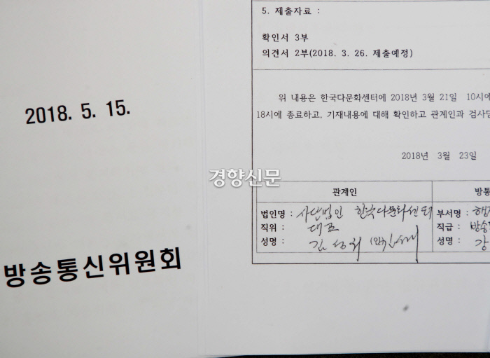 한국다문화센터는 2018년 3월21일부터 23일까지 방송통신위원회의 현장 검사·감독을 받았다. 경향신문이 12일 장경태 더불어민주당 의원을 통해 입수한 방통위의 <(사)한국다문화센터 검사·감독 보고서>(2018년 5월)를 보면, 검사·감독 결과,센터의 부적절한 예산 집행 사례가 다수 발견됐다. 센터는 김 비서관이 회장으로 있던 ‘반딧불이’ 운영을 위한 도메인 등록비, 현수막 제작비용, 복합기 사용료 등 총 29만6800원을 센터의 ‘지급수수료’ 항목 등에서 지출했다. 또 2016년 11월부터 2개월여 동안 센터 사무실을 반딧불이에 임대했다. 김 비서관은 “임대료를 현금으로 수령한 뒤 센터에 입금했다”고 했지만 증빙자료는 제출하지 못했다.