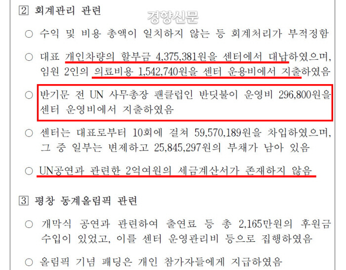 김 비서관이 대학병원에서 101만1540원, 합창단장 장모씨가 한의원·피부과에서 53만1200원 등 총 7차례 개인 의료비를 센터 돈으로 지출한 건도 적발됐다. 레인보우합창단의 2016년 유엔 총회장 공연 당시 계약을 맺은 여행사에 지불된 2억원에 대한 세금계산서가 없다는 사실도 지적됐다.