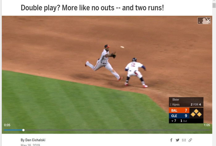 17일 메이저리그 볼티모어-클리블랜드전 7회말 1사 만루 상황에서 병살타를 피하기 위해 몸을 수그린 클리블랜드 주자 프란시스코 린도어. MLB.com 갈무리