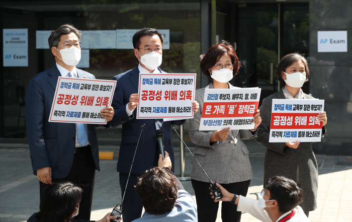 교육위 의원들은 “하루가 멀다 하고 김 후보자 및 그의 가족들 둘러싼 각종 의혹들이 쏟아져 나오고 있다”며 “그 중 국민적 공분을 가장 많이 사고 있는 것이 풀브라이트 장학금 의혹”이라고 했다. 김 후보자는 자신이 풀브라이트재단 장학금을 받은 것을 계기로 한국 풀브라이트 동문회장을 역임했는데, 그 기간 딸과 아들이 모두 풀브라이트 장학금을 받았다. 김 후보자 부인 또한 2004~2005년 미국 필라델피아 템플대에서 1년 동안 교환교수로 있으면서 풀브라이트 장학 프로그램의 지원을 받았다. 의원들은 “김 후보자가 두 자녀의 장학 프로그램 선정에 부당한 영향력을 행사한 것은 아닌지 의심하지 않을 수 없다”고 밝혔다.