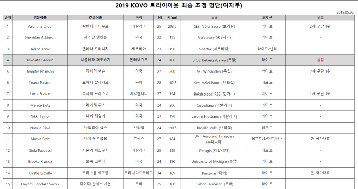 프로배구 여자부 6개팀의 내년 한 해 농사를 책임질 외국인 선수를 선발하는 2019 한국배구연맹(KOVO) 트라이아웃이 캐나다 온타리오주 토론토대 골드링센터에서 1일(현지시간) 막이 올랐다.