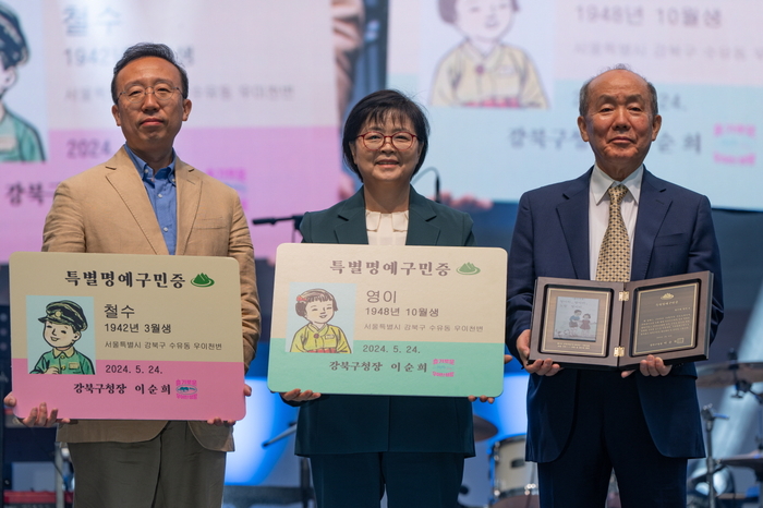 지역에서 어려운 이웃을 위해 봉사해온 김씨와의 인연으로 강북구는 지난 24~26일 개최한 ‘우이천변페스타’에 철수와 영이를 주요 캐릭터로 내세웠다. 또 앞으로 문화관광 분야에서 ‘철수와 영이’와 인연을 이어가자는 취지로 축제 기간 명예구민증 수여식을 열었다.