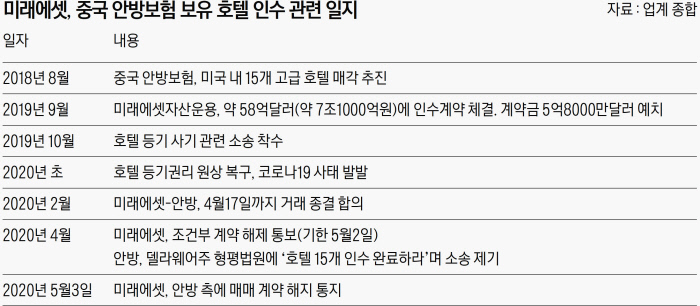 미국 뉴욕의 JW메리어트 에식스하우스 호텔, 실리콘밸리 포시즌스 호텔 등 15개 고급호텔을 58억달러(약 7조1000억원)에 거래하려던 양측의 계약은 이에 따라 약 8개월 만에 법정 싸움으로 비화됐다. 지난해 10월 안방이 미래에셋에 매각하려던 호텔 6곳의 소유권을 제3자가 문서를 위조해 양도하려던 사건이 발생하자, 안방 측은 캘리포니아주 법원에 위조 문건에 대한 취소 소송을 제기했다. 이때부터 미래에셋과 안방 측의 협상에서 잡음이 불거졌다.