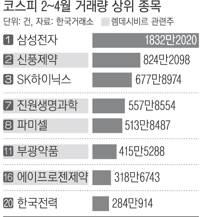5일 한국거래소에 따르면 지난 2~4월 국내 유가증권시장 거래량 상위 20위 내에 렘데시비르 관련주로 불리는 종목들이 여럿 포진했다. 국내 최고 대장주인 삼성전자 거래량이 1위(1832만2020건)를 차지한 가운데 신풍제약이 2위(824만2098건)로 뒤를 이었다. 또 다른 관련주로 꼽히는 진원생명과학(7위)과 파미셀(8위)도 10위 내에 들었고, 부광약품(11위), 에이프로젠제약(16위)도 상위에 올랐다.