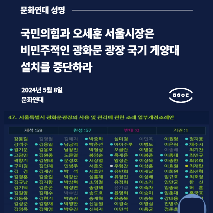 문화연대는 8일 ‘국민의힘과 오세훈 서울시장은 비민주적인 광화문 광장 국기게양대 설치를 중단하라’는 제목의 성명을 내 이같이 밝혔다.