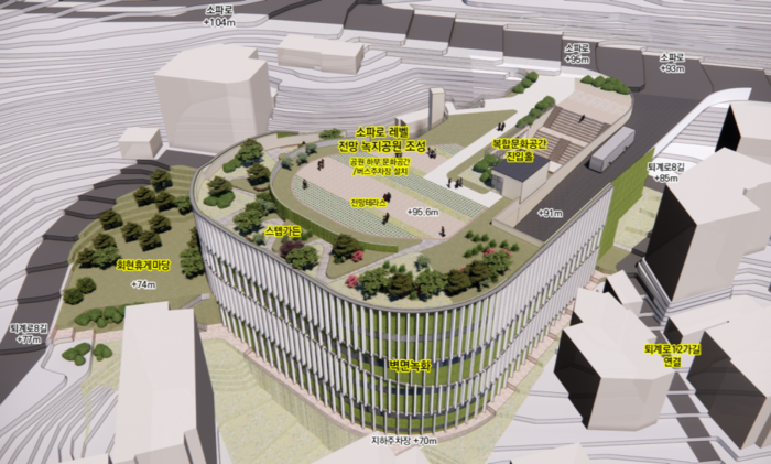 소파로변에서 바로 진입 가능하고 남산공원 끝자락에 있는 지형을 살려 상부(4층)에는 전망공원과 테라스를 만든다. 서울 도심을 한눈에 감상할 수는 공간이 될 예정이다. 야외공연과 이벤트도 열 수 있게 꾸민다.