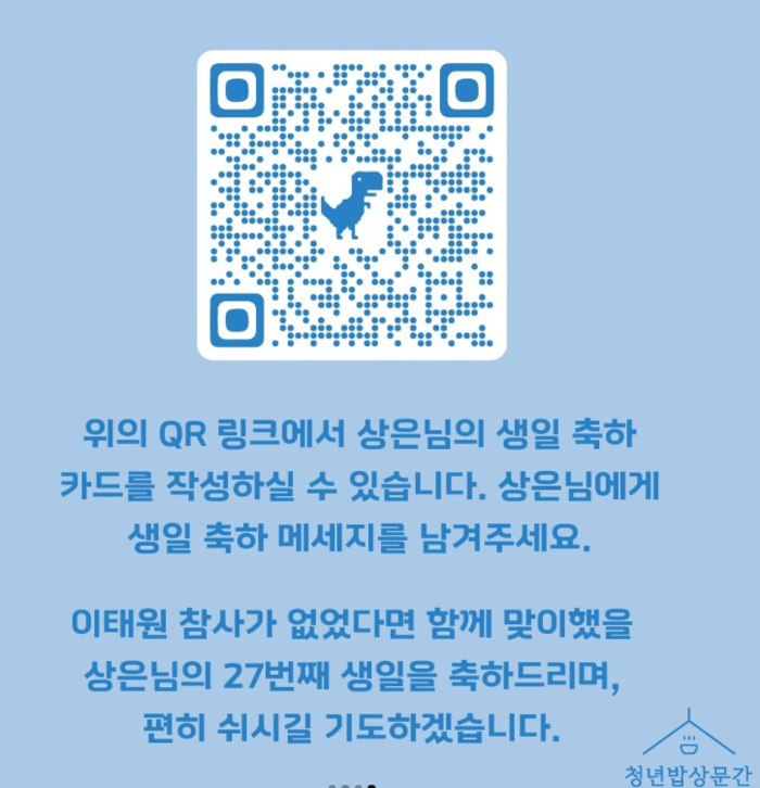 식당에는 이상은씨에게 남기는 글을 적을 수 있게 웹카드에 접속할 수 있는 QR코드도 함께 선보일 예정이다. 청년식당문간 사회관계망서비스(SNS)에서는 이미 QR코드가 공개됐다. 강씨는 “상은이를 기억하고, 또 참사 희생자를 기억해주셨으면 하는 마음”이라며 “언제까지 식사 나눔을 계속할지 정하지는 않았다. 다만 저희도 힘 닿는 데까지는 해 보고 싶다”고 말했다.
