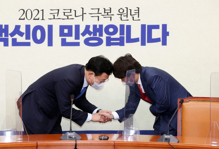 송 대표와 이 대표는 이날 국회 민주당 대표 회의실에서 만났다. 각자의 당 상징색인 파란색·붉은색 넥타이를 맨 두 대표는 상대를 향해 웃으며 90도로 인사했다.