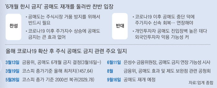 금융당국이 공매도를 금지한 것은 앞서 2008년 금융위기, 2011년 미국 신용등급 강등 당시에 이어 지난 3월 코로나19 여파가 역대 세 번째다. 이후 국내 증시가 반등해 코로나19 확산 전 수준으로 복귀하자 ‘공매도 금지’ 효과라는 주장이 나왔다. 최유준 신한금융투자 연구원은 “공매도 금지가 코스피를 9% 정도 부양한 효과가 있다”고 말했다. 역으로 공매도가 재개될 경우 주가가 급락할 것으로 개인투자자들은 우려한다.