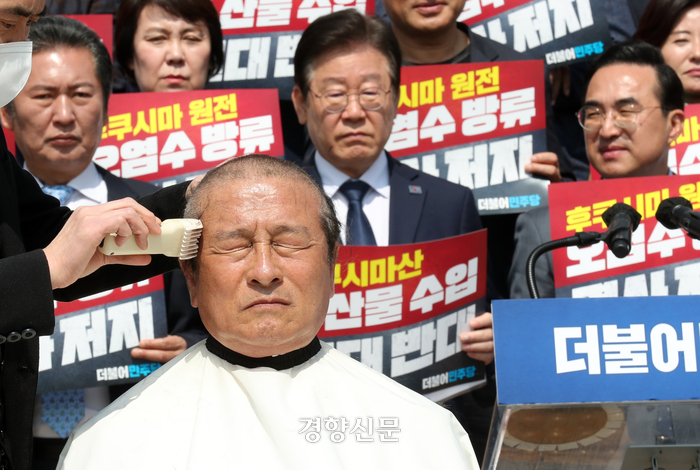 더불어민주당 해양수산특별위원장인 윤재갑 의원이 20일 일본 후쿠시마 원전 오염수 방류를 규탄하며 단식투쟁에 돌입하겠다고 밝혔다. 윤 의원은 지난 3월에는 후쿠시마 수산물 수입에 반대하며 삭발했다.