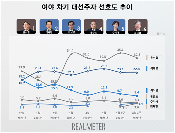 리얼미터는 오마이뉴스 의뢰로 실시한 ‘2021년 6월 4주 차기 대선주자 선호도 조사’ 결과 윤석열 전 총장의 지지도가 전주보다 2.8%포인트 하락한 32.3%였다고 밝혔다. 이 조사는 지난 21~22일 전국 18세 이상 2014명을 대상으로 유·무선 자동응답(ARS) 방식으로 실시한 것이다.